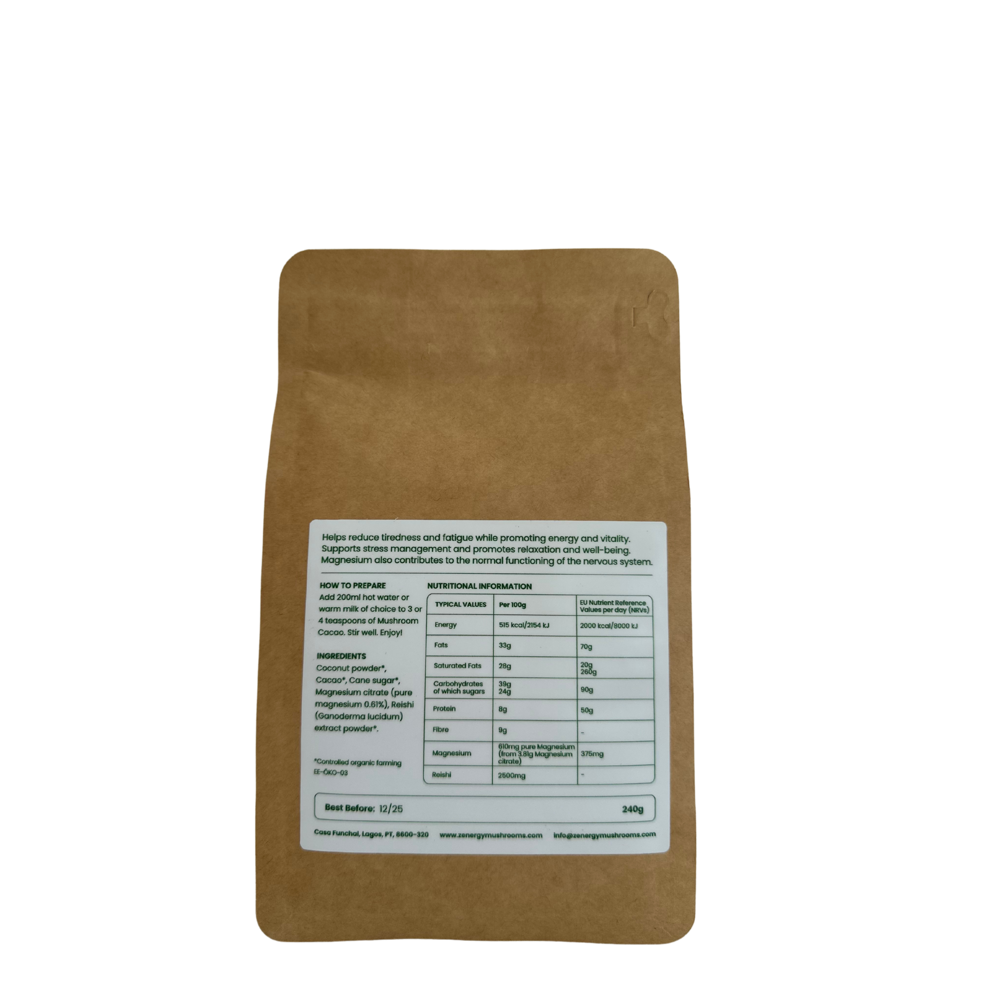 Coconut powder*, Cacao*, Cane sugar*, Magnesium citrate (providing 0.61% pure magnesium), Reishi (Ganoderma lucidum) extract powder*.