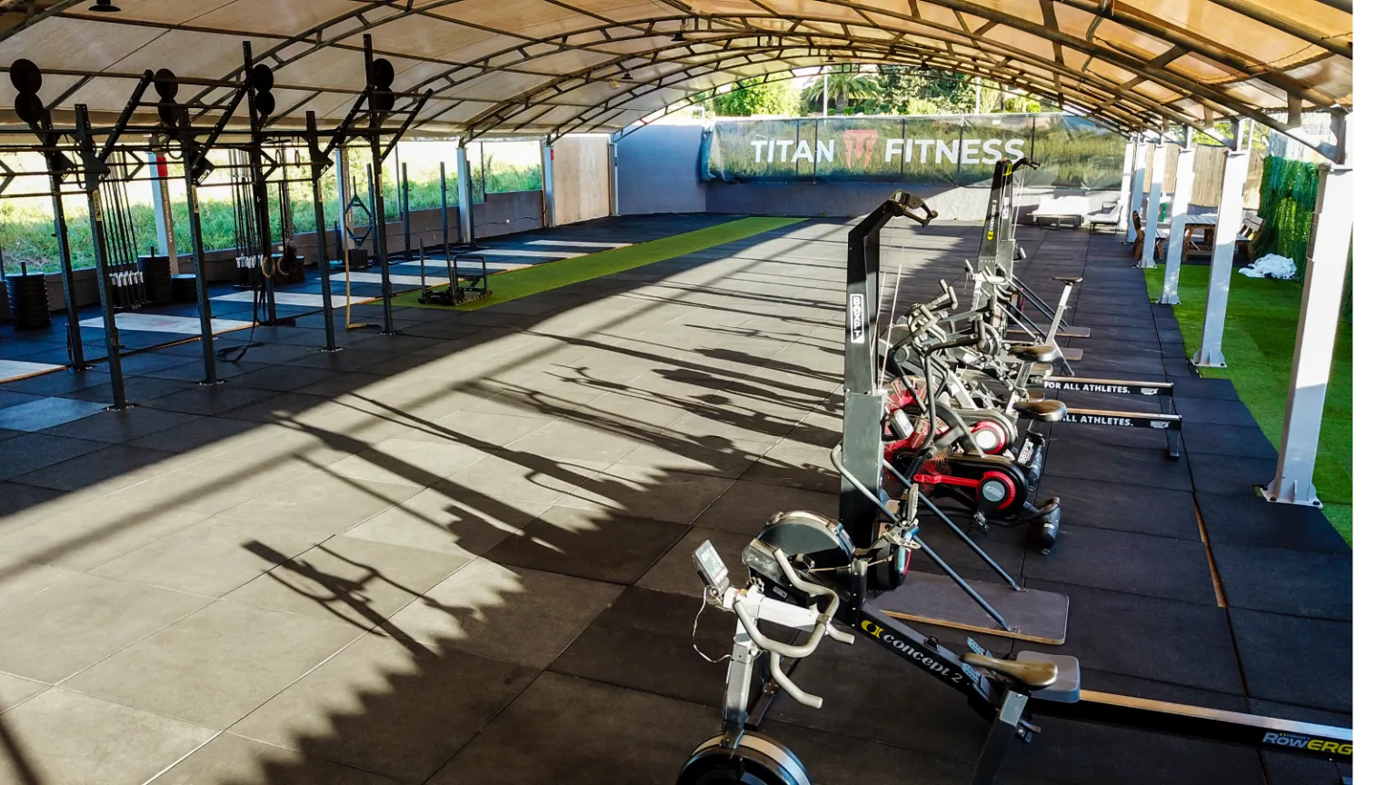 With a total size of over 520 sqm Titan Fitness Algarve is one of Europe’s biggest outdoor fitness holiday destinations. Our training area is a fitness enthusiast’s dream! The space including a functional training area, six bay rig, 8 wooden platforms suitable for specialized lifting, a huge selection of male, female and training barbells, kettlebells, dumbbells, plates, benches and much more.